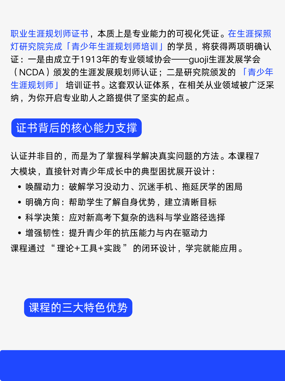 职业生涯规划师证书,本质上是专业能力的可视化凭证。在生涯探照灯研究院完成「青少年生涯规划师培训」的学员,将获得两项明确认证:一是由成立于1913年的专业领域协会——guoji生涯发展学会(NCDA)颁发的生涯发展规划师认证;二是研究院颁发的 「青少年生涯规划师」 培训证书。这套双认证体系,在相关从业领域被广泛采纳,为你开启专业助人之路提供了坚实的起点。
