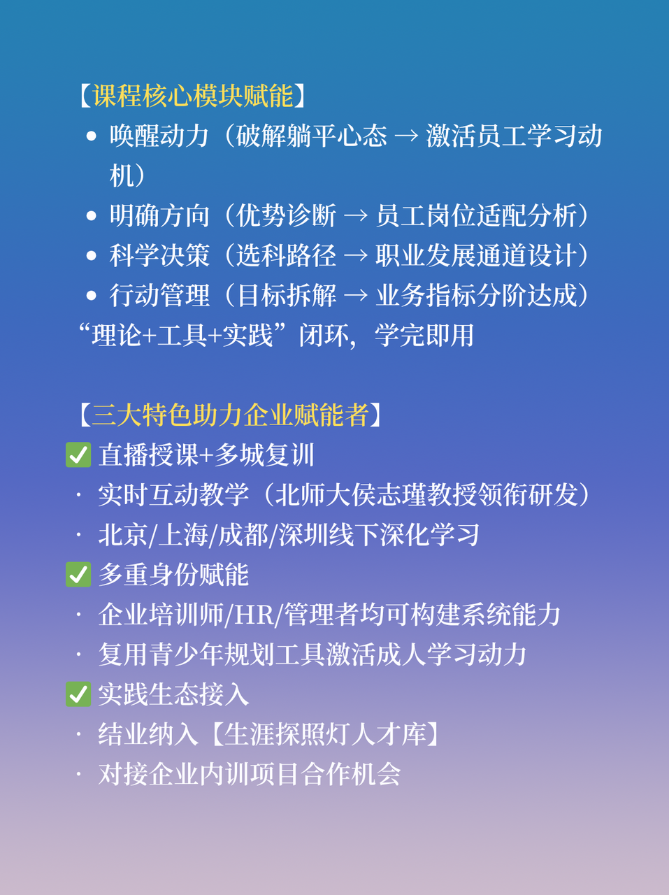 生涯探照灯 青少年生涯规划师课程 培养的核心能力,正是破解企业培训痛点的密钥: